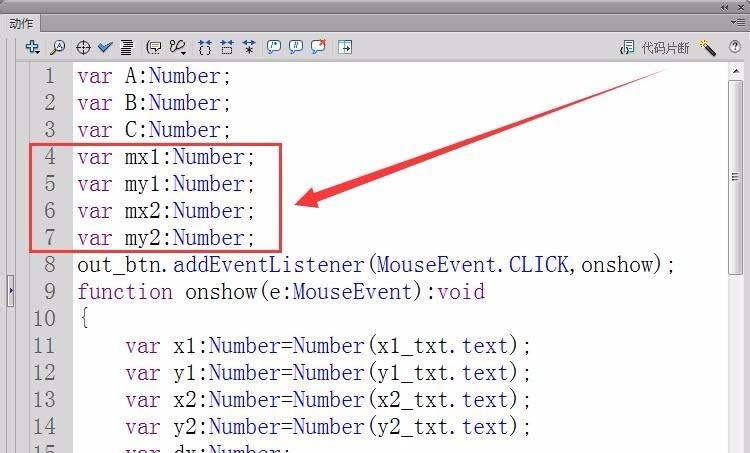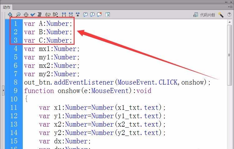 5、新建一個圖層,在第1幀打開動作面板。首先,新建3個實型變量,用來保存垂直平分線的3個系數A、B、C。