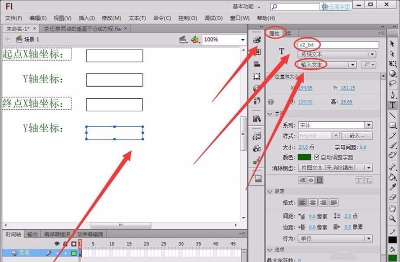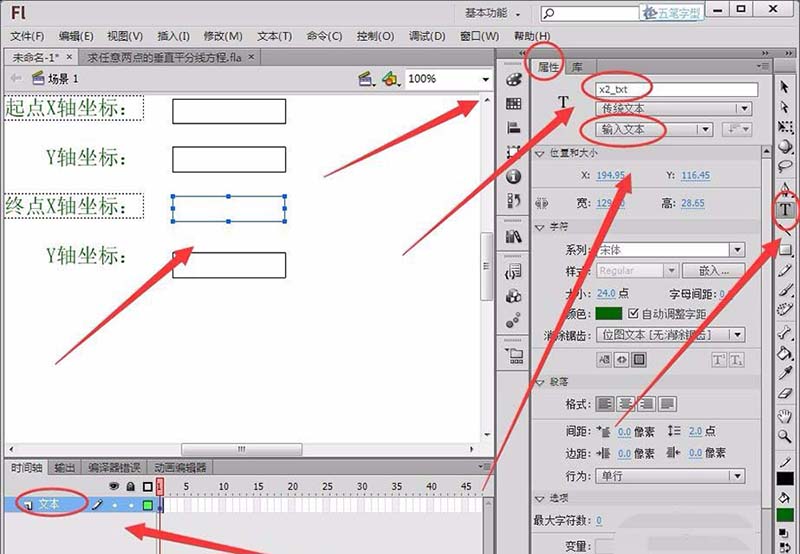 2、用上一步的方法在舞臺繪制2個輸入終點坐標的輸入文本框,將實例名稱取名為“x2_txt”和“y2_txt”。