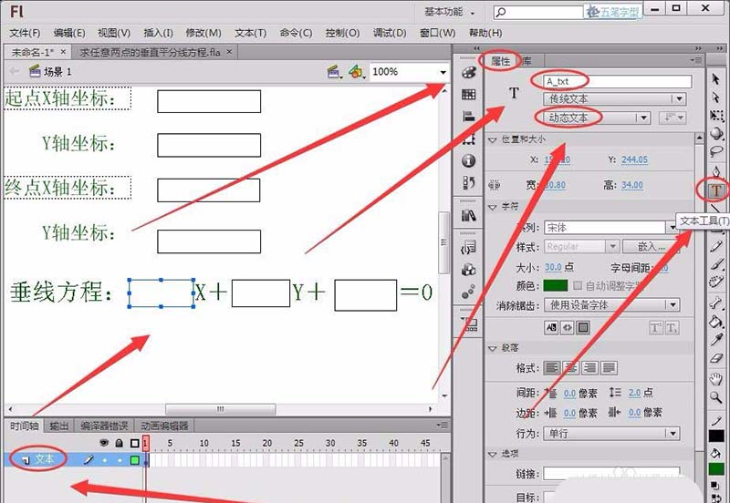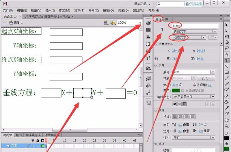 3、用文本工具在舞臺繪制輸出垂直平分線方程的動態文本框,將3個動態文本框的實例名稱取名為“A_txt”、“B_txt”和“C_txt”,表示直線方程的3個系數。