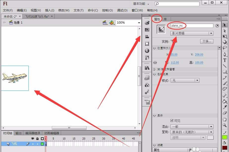 1、在舞臺繪制一個“飛機”影片剪輯元件,將實例名稱取名為“plane_mc”。