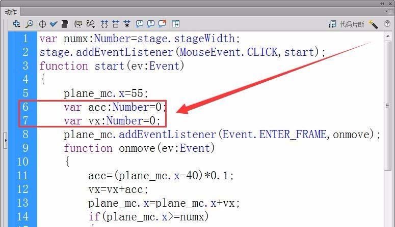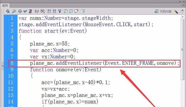 7、注冊飛機元件plane_mc的enterframe事件的偵聽器,具體控制飛機的飛行。