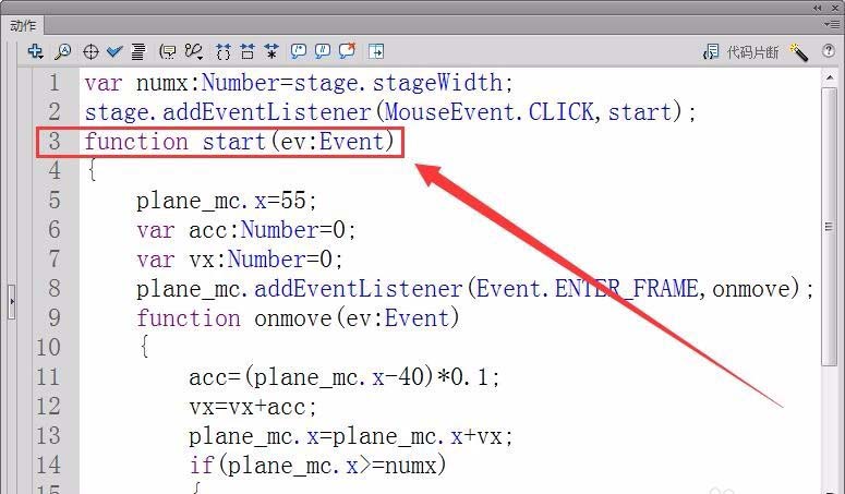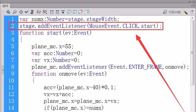 4、注冊舞臺的鼠標單擊事件的偵聽器,當鼠標在舞臺單擊后,飛機開始飛行。