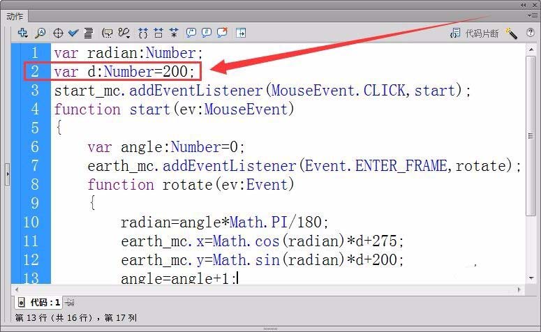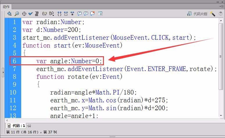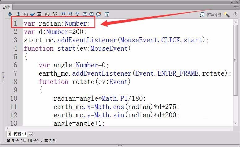 4、新建一個“代碼”圖層,打開動作面板。首先,定義浮點型變量radian,保存地球轉(zhuǎn)過的角度的弧度值。