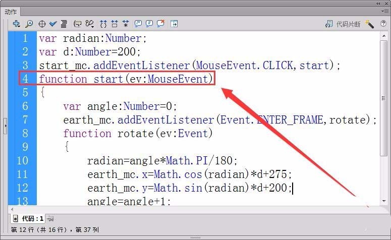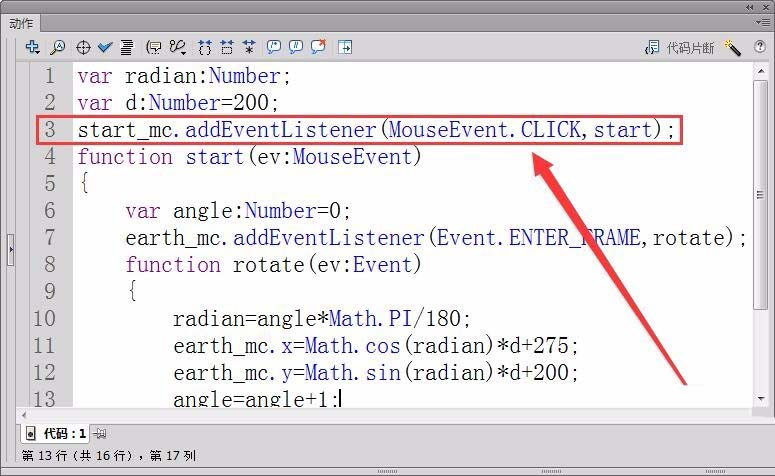 7、定義偵聽器函數(shù)start,控制地球開始旋轉(zhuǎn)。