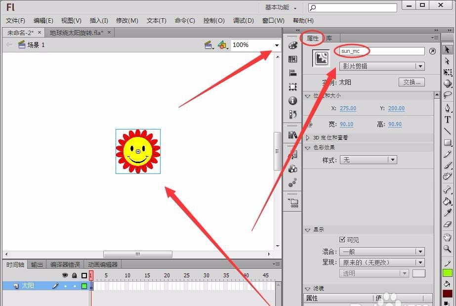1、制作一個太陽影片剪輯元件,將其從庫面板中拖動到舞臺中心,在屬性面板中將實例名稱取名為“sun_mc”。