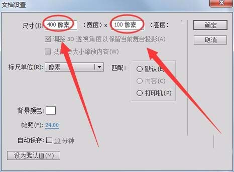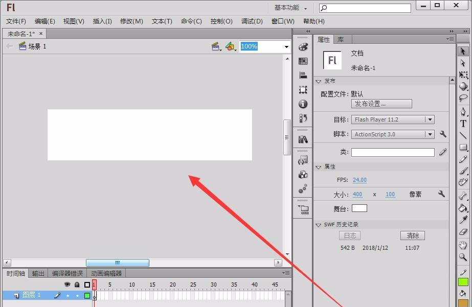 2、在“尺寸”中可以設置舞臺的大小,默認大小寬度是550像素,高度是400像素。本人將其值改為400×100,可以看到舞臺變成了一個長條。