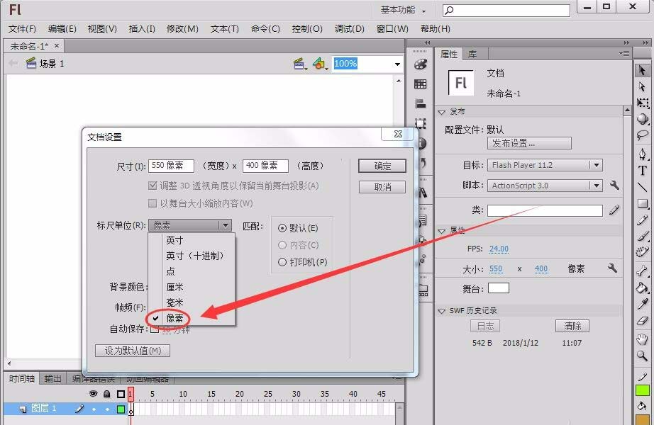 3、在“標尺單位”后可以設置舞臺尺寸的單位,可以選擇英寸、點、厘米、毫米和像素,大家可以根據實際情況選擇設置。