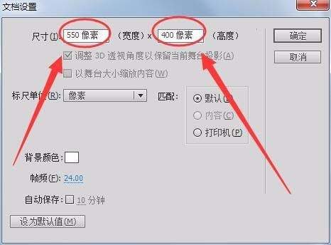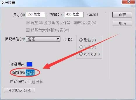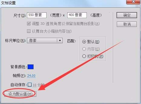 7、“設為默認值”選項,可以將當前的設置更改為默認值,設置以后每次新建Flash文檔,屬性值都自動設置為設置好的值。