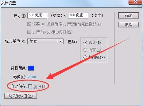 6、“自動保存”后的選項,可以設置Flash每次自動保存的時間間隔,默認值為10分鐘。