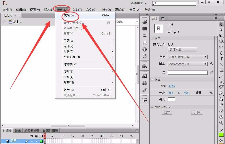 1、單擊“修改”---->“文檔”,打開文檔屬性窗口。