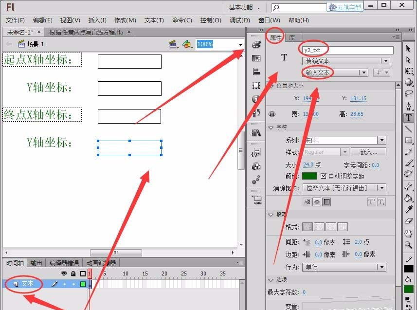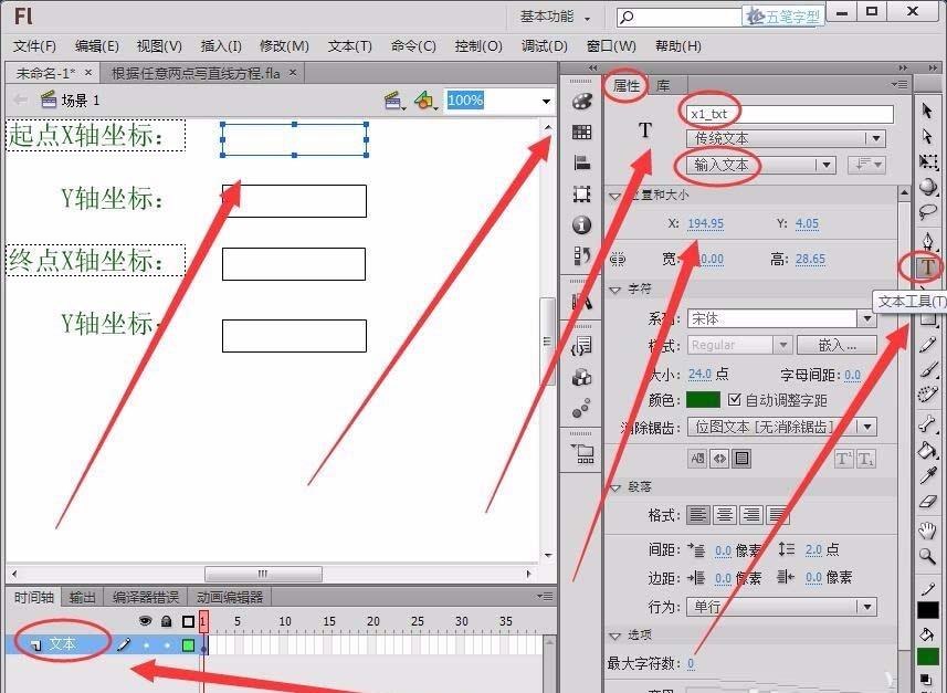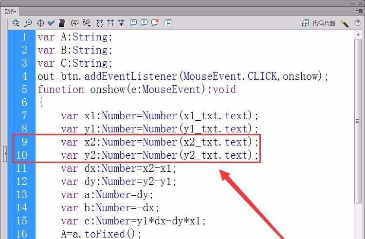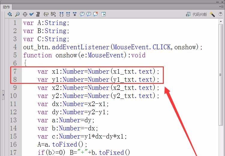 7、定義兩個實型變量x1和y1,用來存儲第一個點的坐標,用text屬性獲取舞臺中輸入的坐標值。