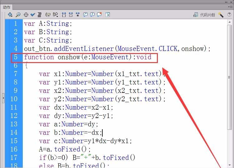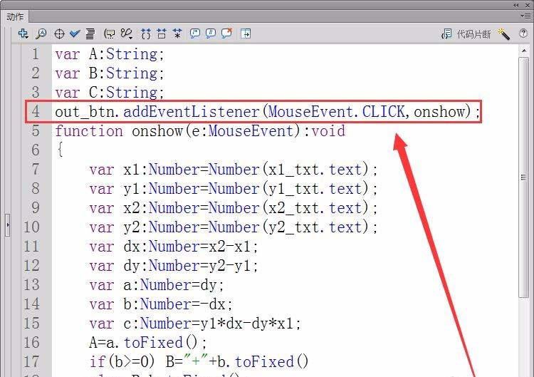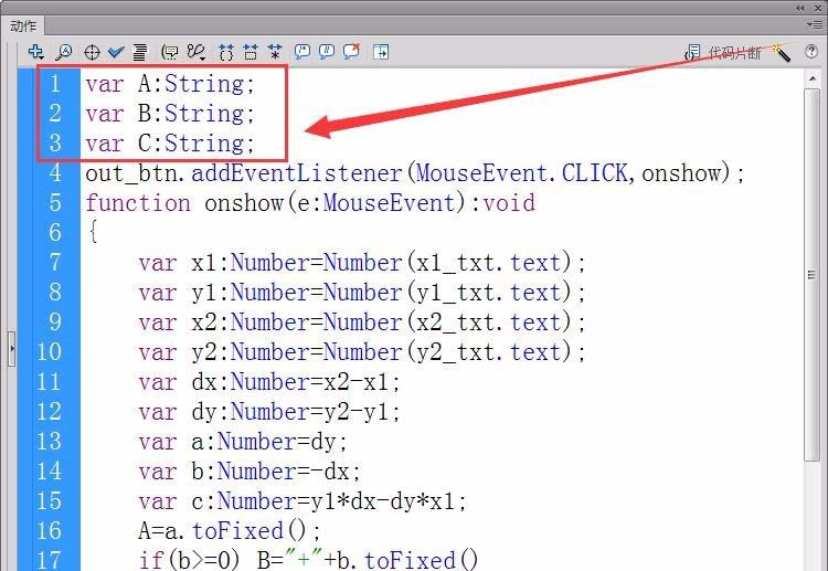 4、新建一個代碼圖層,打開“動作”面板。首先,定義三個字符串變量A、B、C,用來保存直線方程的三個系數。