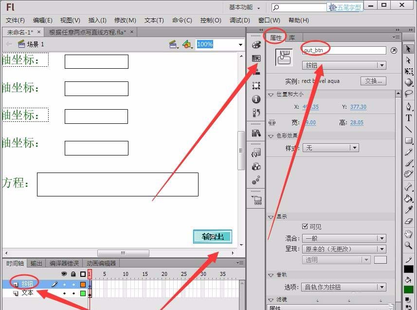 3、新建一個“按鈕”圖層,插入一個按鈕“輸出”,將實例名稱取名為“out_btn”。