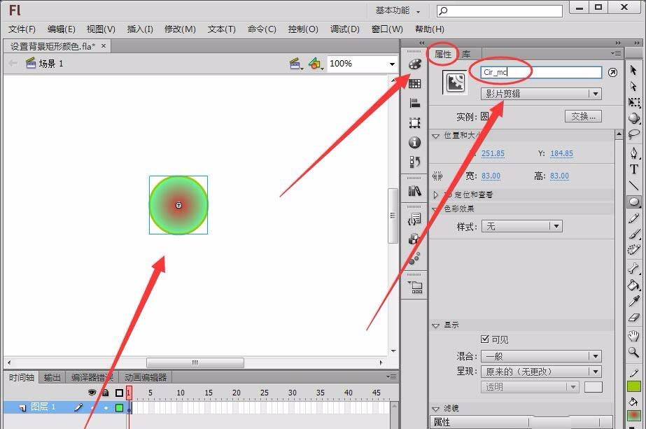 4、選中圓形,我們可以看,背景矩形是沒有顏色的,如何讓背景區域變成自己想要的顏色呢?首先,在屬性面板中給實例取一個名字,本例將實例名稱取名為“Cir_mc”。