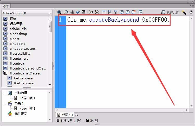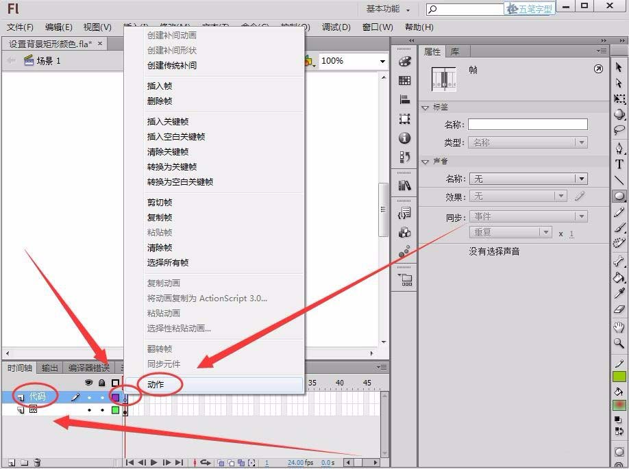 5、新建一個圖層命名為“代碼”,在第1幀打開“動作”面板。