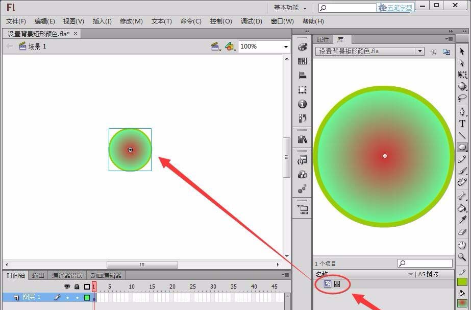 3、回到場景1,將庫面板中的影片剪輯“圓”拖動到舞臺中。