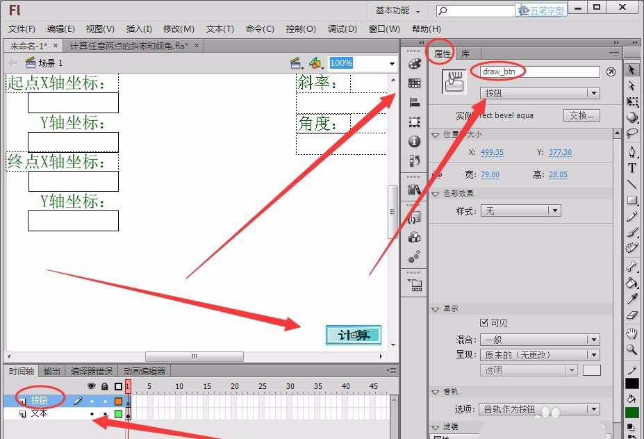3、新建一個(gè)按鈕圖層,插入一個(gè)按鈕“計(jì)算”,將實(shí)例名稱取名為“draw_btn”。