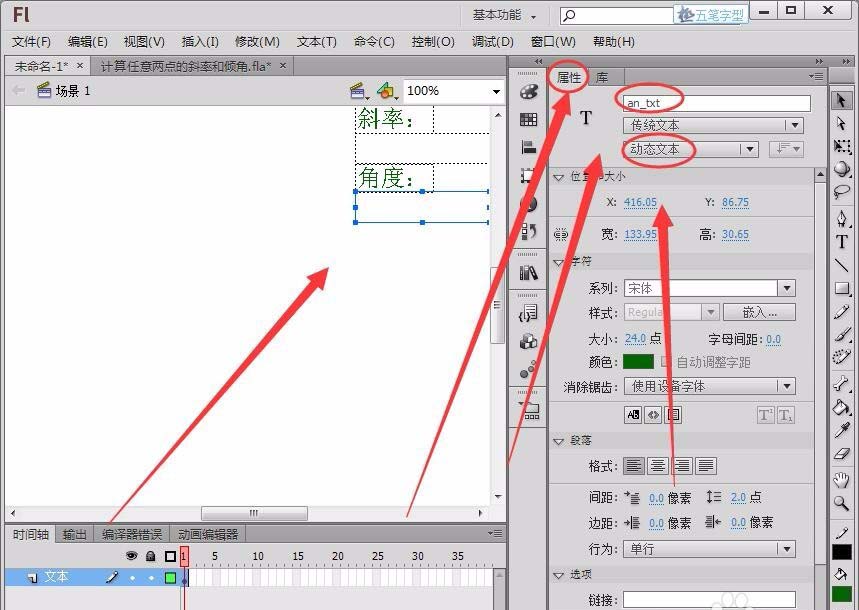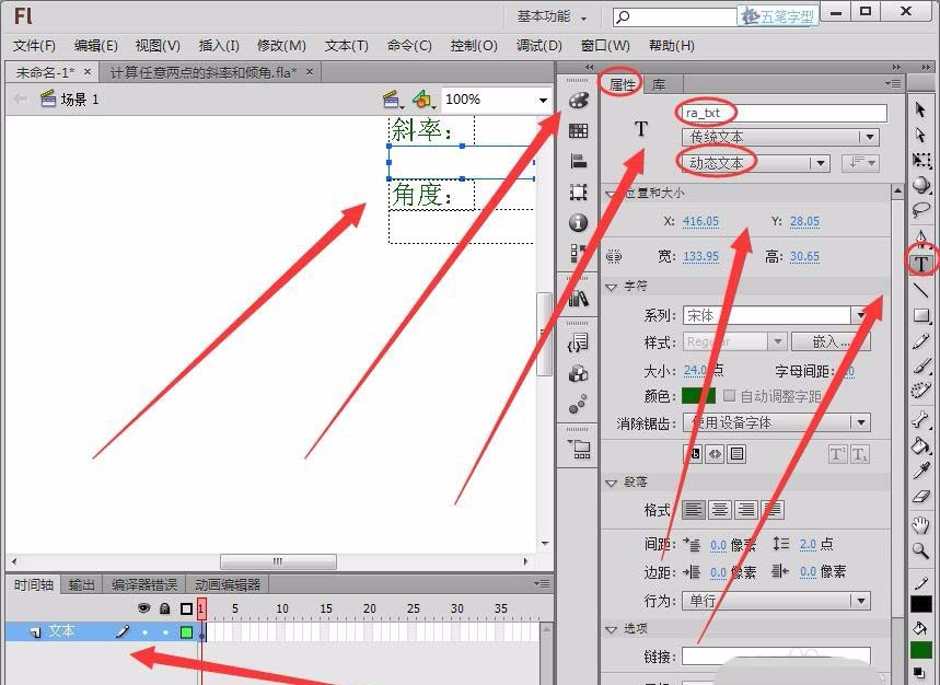 1、選擇“文本工具”,在舞臺(tái)右上角繪制兩個(gè)動(dòng)態(tài)文本框,在屬性面板中,將實(shí)例名稱取名為“ra_txt”和“an_txt”。