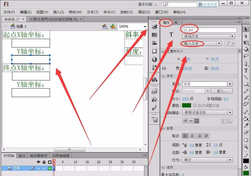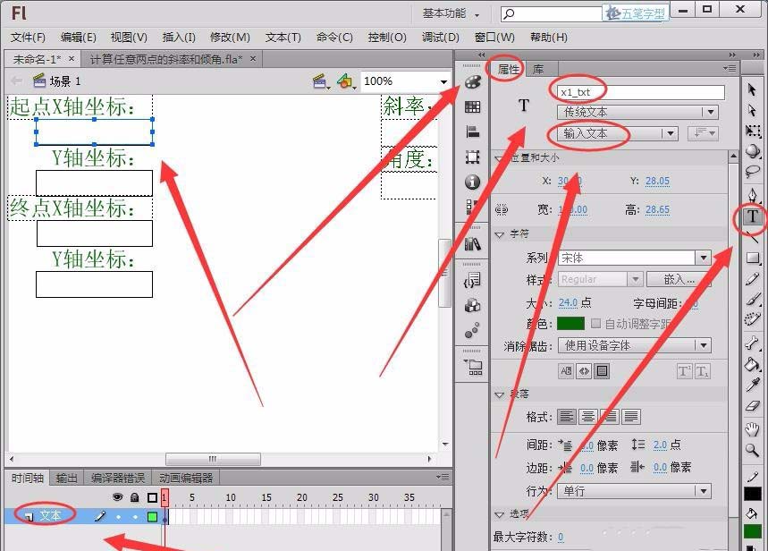 2、用文本工具在舞臺(tái)左上方繪制4個(gè)輸入文本框,將實(shí)例名稱分別取名為“x1_txt”、“y1_txt”、“x2_txt”和“y2_txt”。