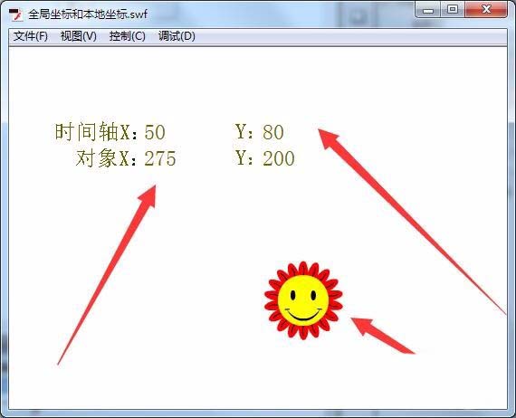 10、運行程序后,單擊太陽對象,舞臺中即輸出時間軸的坐標(0,0),以及對象的坐標(275,200)。可以看出時間軸的默認位置是在舞臺的最左上方。