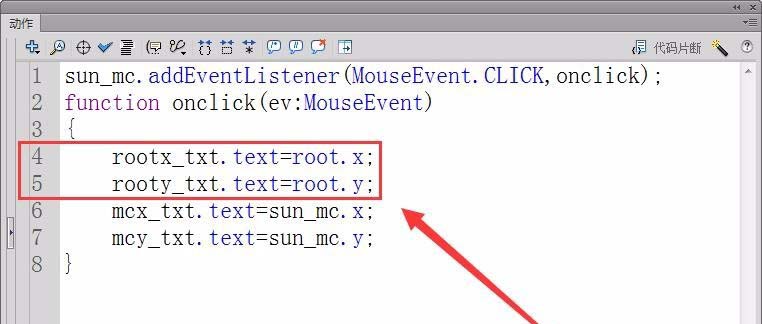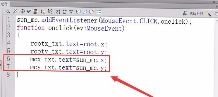9、在舞臺中,輸出對象sun_mc的X軸坐標和Y軸坐標,代碼如下圖所示。