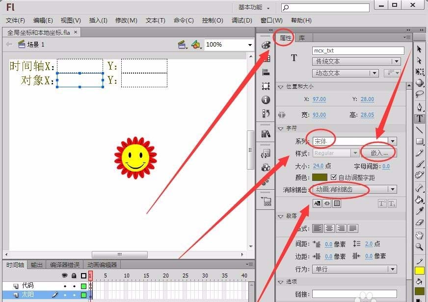 4、在“屬性”面板中“系列”設置為宋體,“消除鋸齒”設置為“動畫消除鋸齒”,單擊“嵌入”,分別為4個動態文本框嵌入字體。