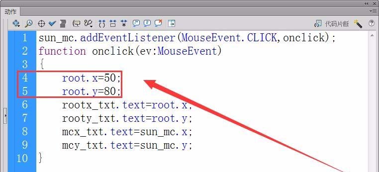 11、我們修改一下“動作”面板中的代碼,將時間軸X軸的坐標設置為50,Y軸坐標設置為80。
