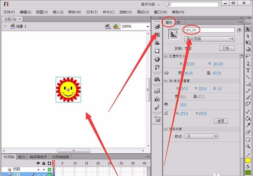 2、在作品中已創建了一個影片剪輯元件“太陽”,在舞臺繪制了一個“太陽”的對象,在“屬性”面板中,將對象的“實例名稱”取名為“sun_mc”。