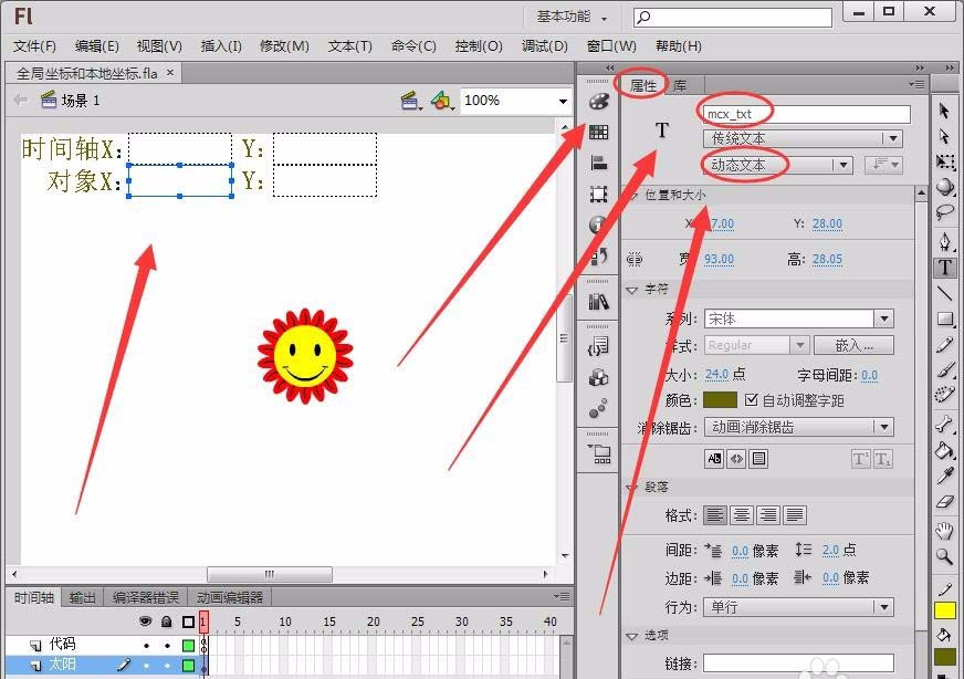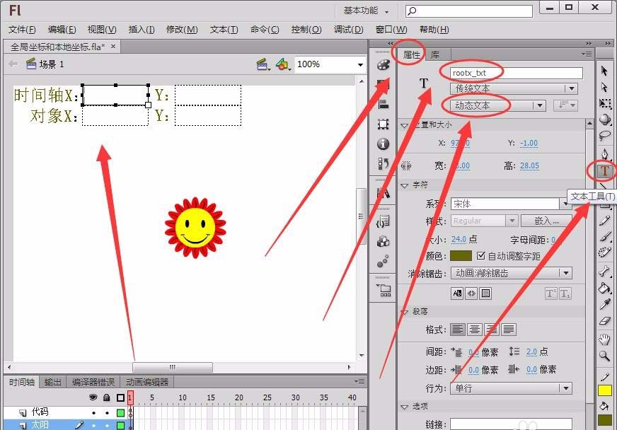 3、選擇“編輯欄”中的“文本工具”,在“屬性”面板中設置為“動態文本”,在舞臺中繪制4個動態文本框,分別將“實例名稱”取名為“rootx_txt”、“rooty_txt”、“mcx_txt”和“mcy_txt”。
