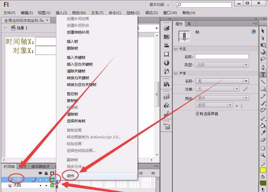 5、在“代碼”圖層的第1幀右擊,選擇“動作”選項。