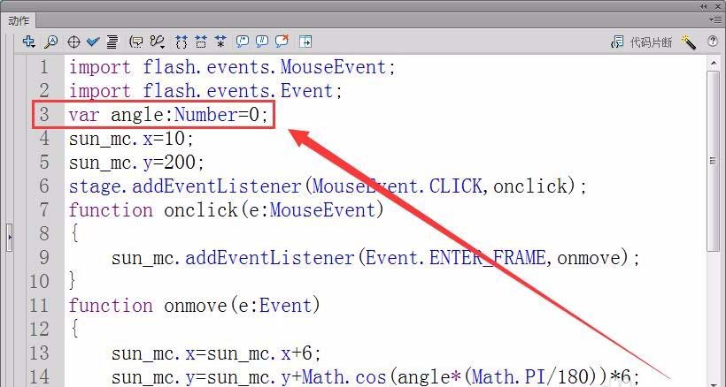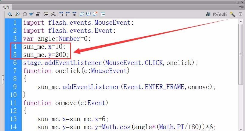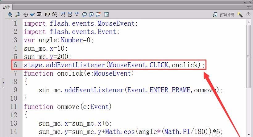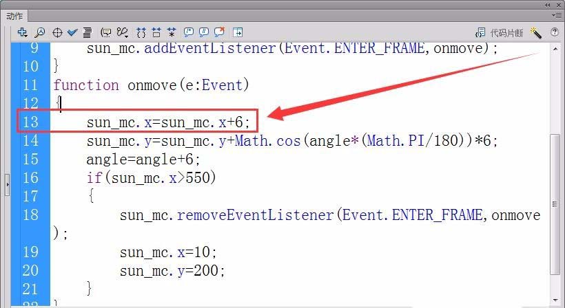 8、設置對象sun_mc每次在X軸方向移動的距離為6像素,代碼如下圖所示。