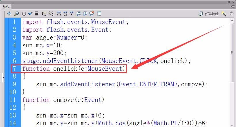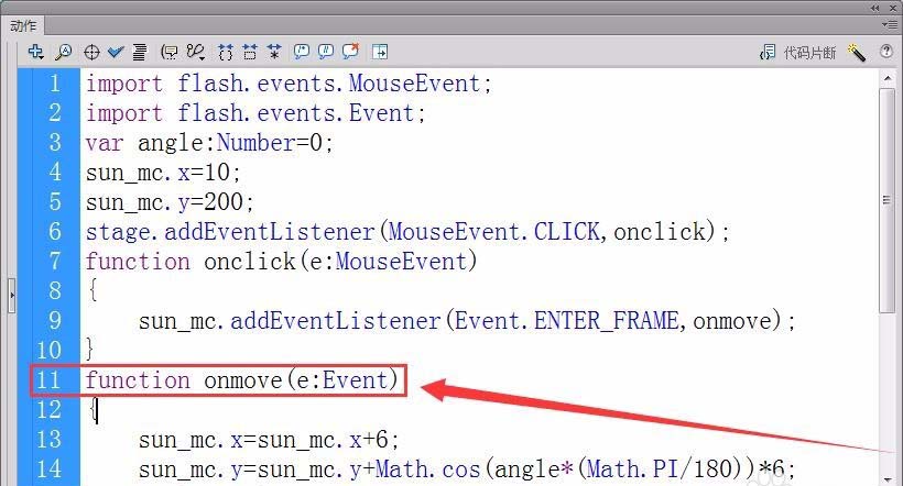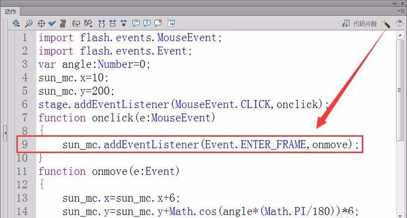 6、注冊對象sun_mc的enterframe事件的偵聽器,接收者函數為onmove。