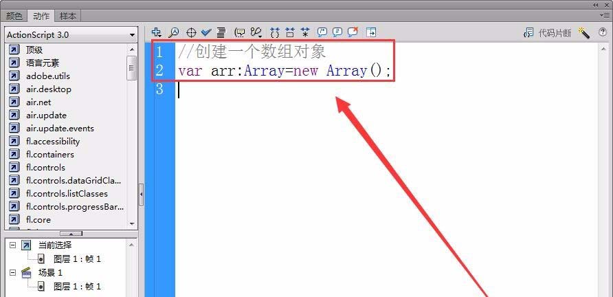 1、先用構(gòu)造函數(shù)創(chuàng)建一個數(shù)組對象,“動作”面板中的代碼如下圖所示。