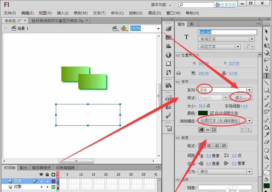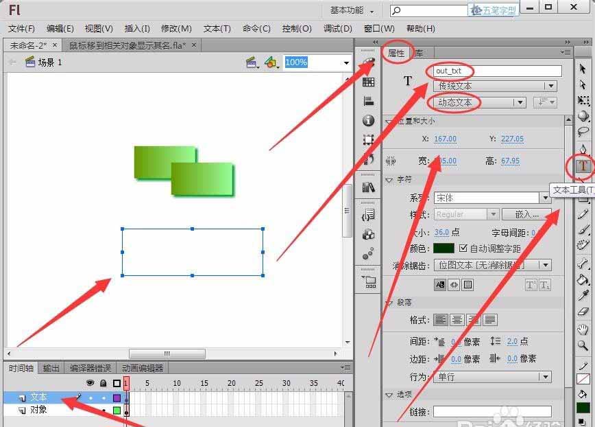 5、新建一個圖層命名為“文本”,選擇“文本工具”,在“屬性”面板中選擇“動態(tài)文本”,在舞臺繪制一個動態(tài)文本框,將“屬性”面板中的“實例名稱”取名為“out_txt”。(注:要嵌入字體,運行程序后動態(tài)文本才能正常顯示)