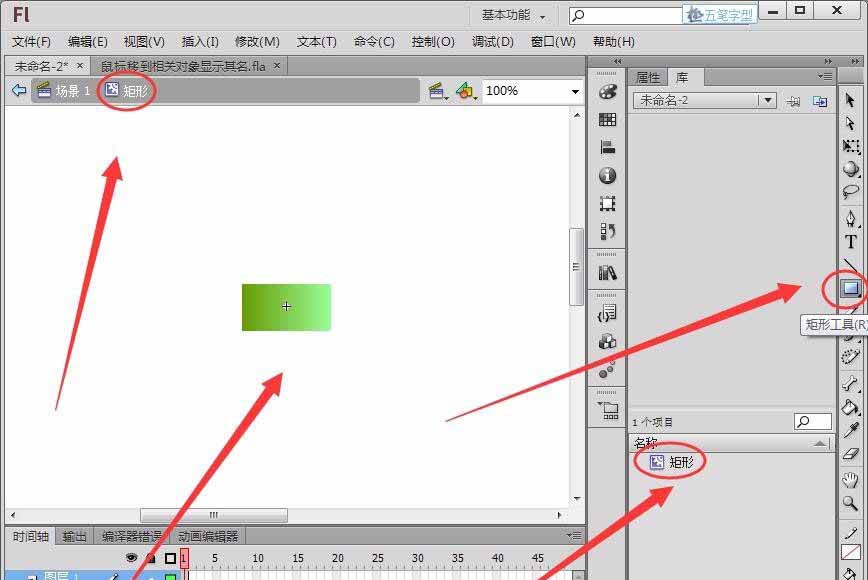 3、在“編輯欄”選擇“矩形工具”,在元件編輯窗口繪制一個矩形。