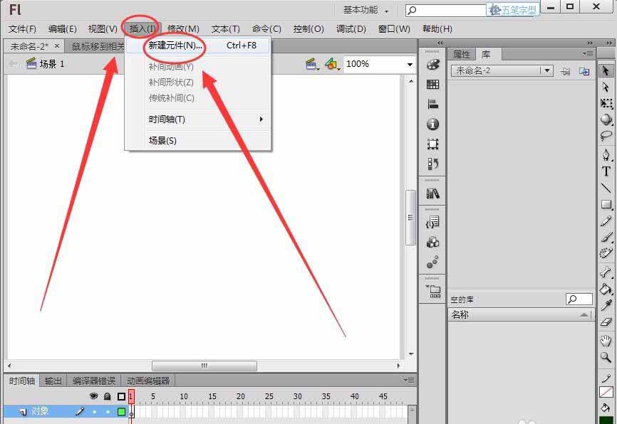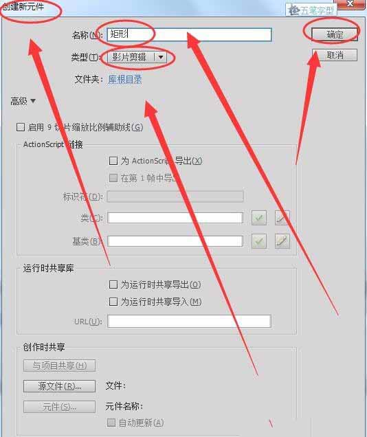 2、單擊“插入”---->“新建元件”,在出現(xiàn)的“創(chuàng)建新元件”對話框中,“名稱”取名為“矩形”,“類型”為“影片剪輯”,單擊“確定”。