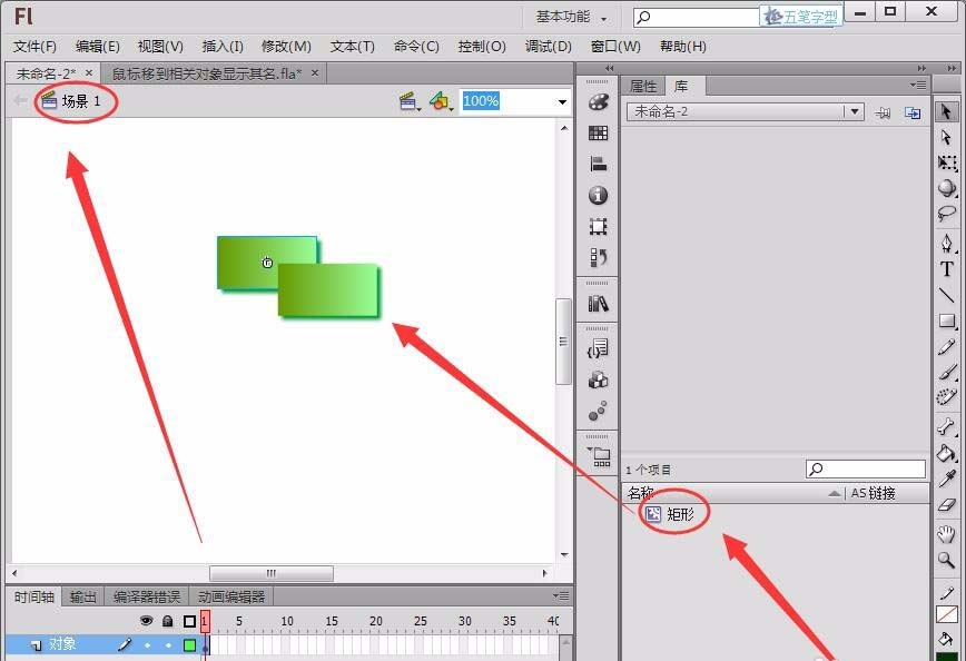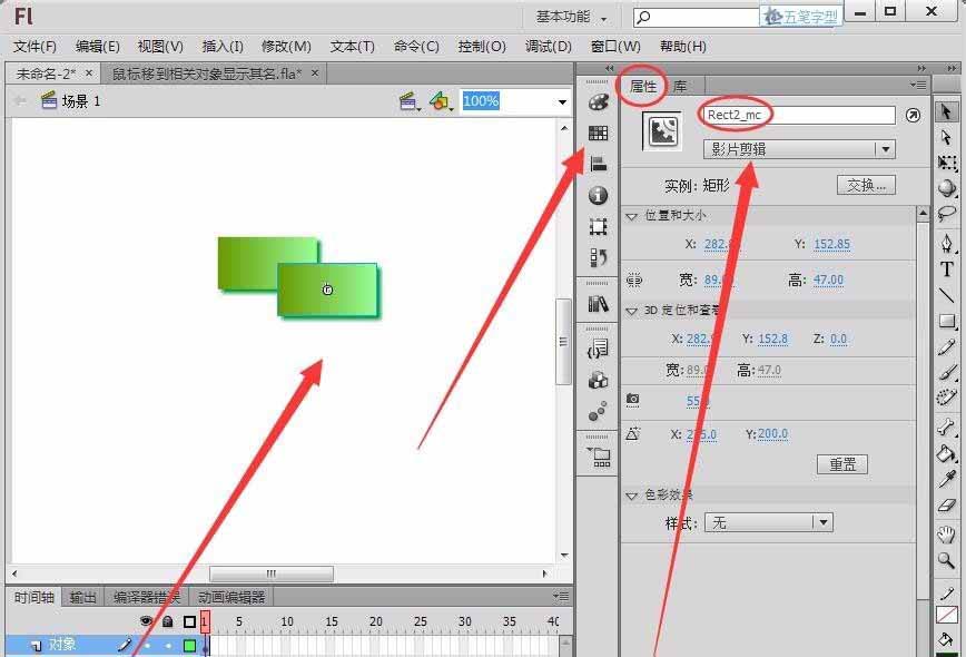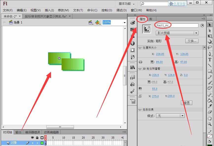 4、回到場景1,在舞臺拖出兩個矩形影片剪輯元件,在“屬性”面板中,將它們的“實例名稱”分別取名為“Rect1_mc”和“Rect2_mc”。