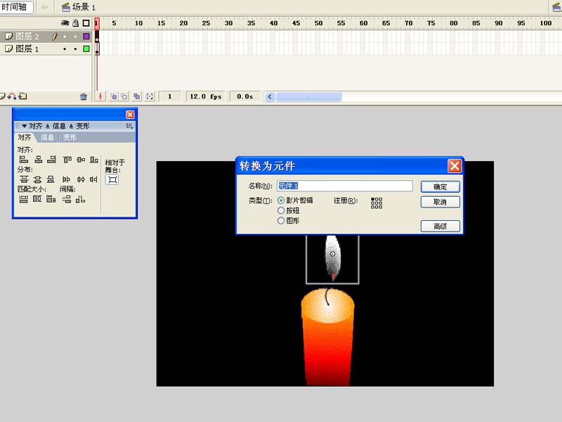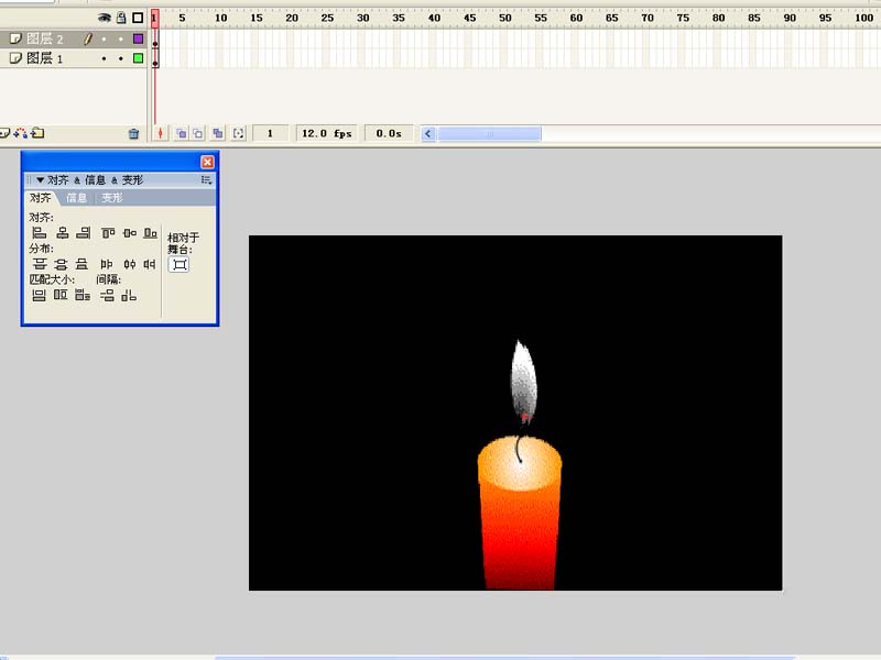 3、從庫中拖拽蠟燭素材到舞臺,調整其大小和位置,采用同樣的方法將火焰拖拽到舞臺。