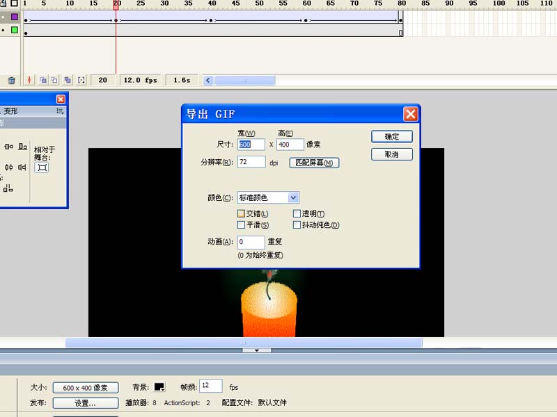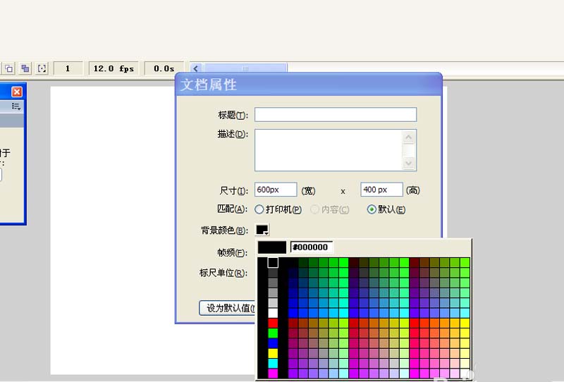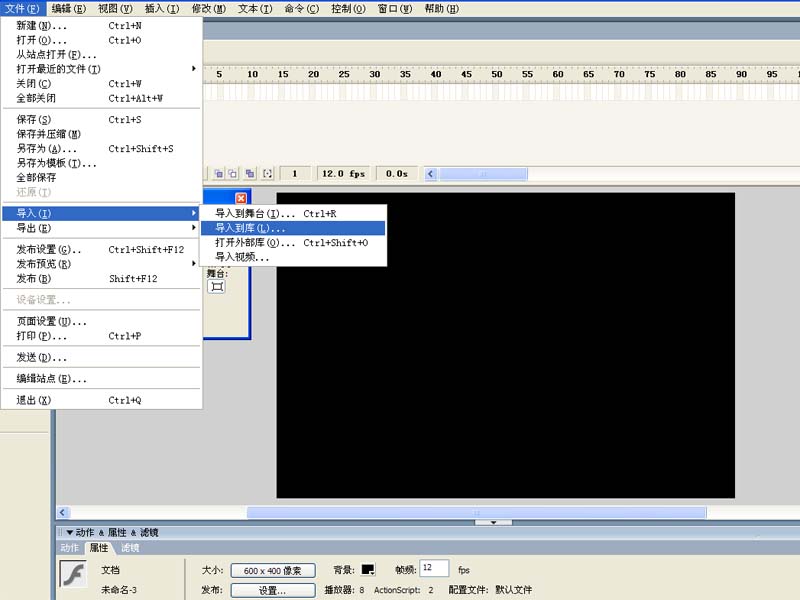 1、首先啟動flash8,新建一文檔,大小為600*400,幀頻為12fps,背景顏色為黑色。