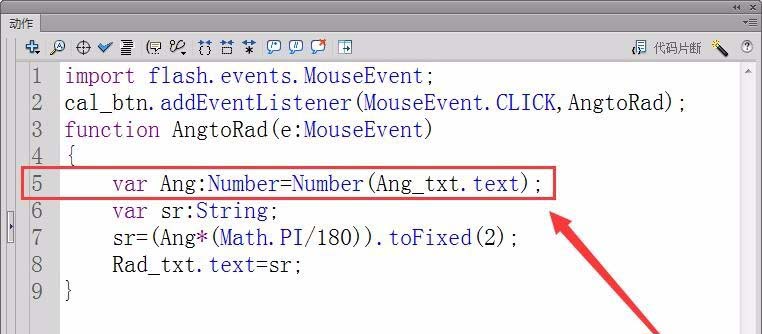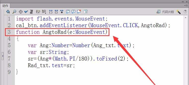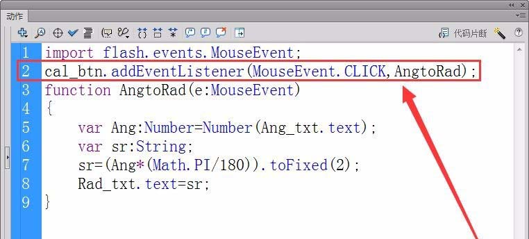 6、首先,注冊按鈕cal_btn的鼠標單擊事件的偵聽器,接收者函數為AngtoRad。