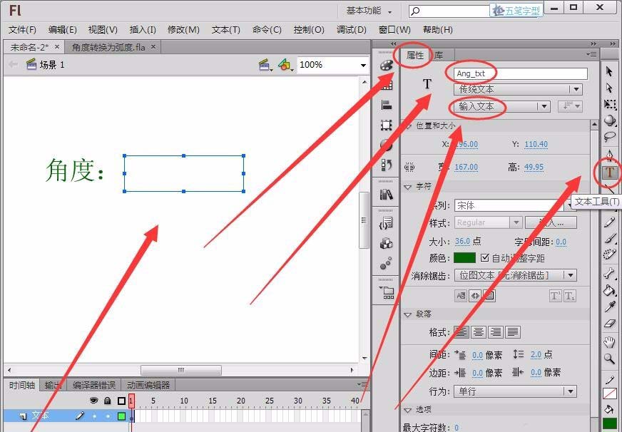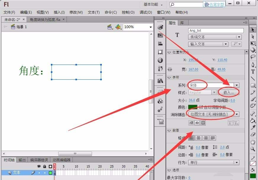 2、選擇“編輯欄”中的“文本工具”,在舞臺繪制一個“輸入文本”框,將“實例名稱”取名為“Ang_txt”。(注:要嵌入字體,輸入文本內容才能在舞臺正常顯示)
