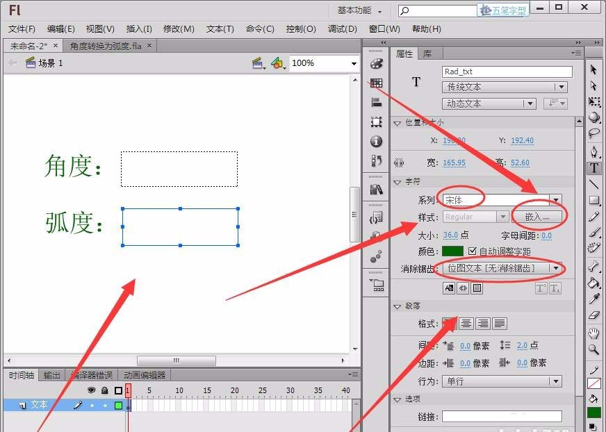 11、最后,在舞臺的動態文本框中輸出弧度值。