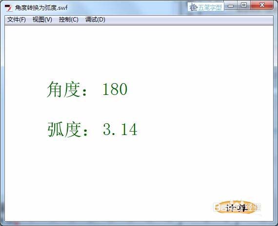 12、運行程序,在“角度”文本框中輸入角度值后,單擊“確定”,在舞臺輸出弧度值。