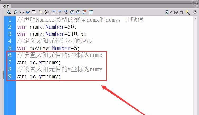 7、設置“太陽”元件的x軸坐標為numx,y軸坐標為numy。