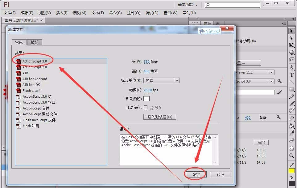 1、打開Flash軟件,選擇“文件”---->“新建”,在出現的對話框中選擇“ActionScript3.0”,新建一個空白文檔。