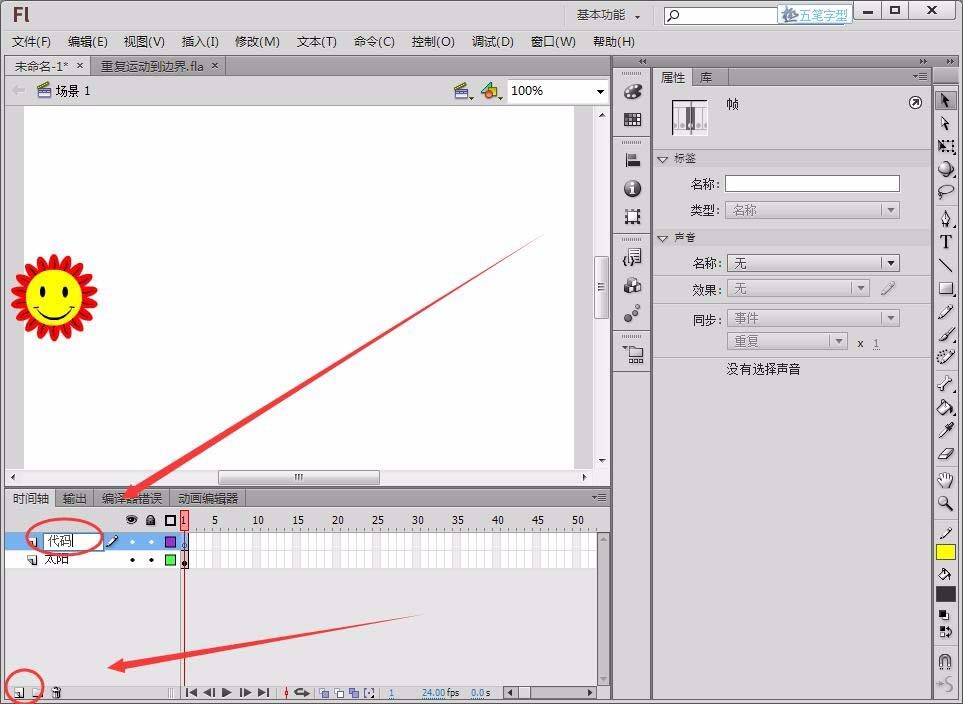 3、新建一個圖層,命名為“代碼”,在“太陽”圖層的第三幀插入一個普通幀。