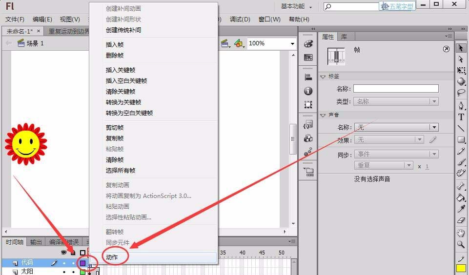 4、在“代碼”圖層的第一幀右擊,選擇“動作”選項。