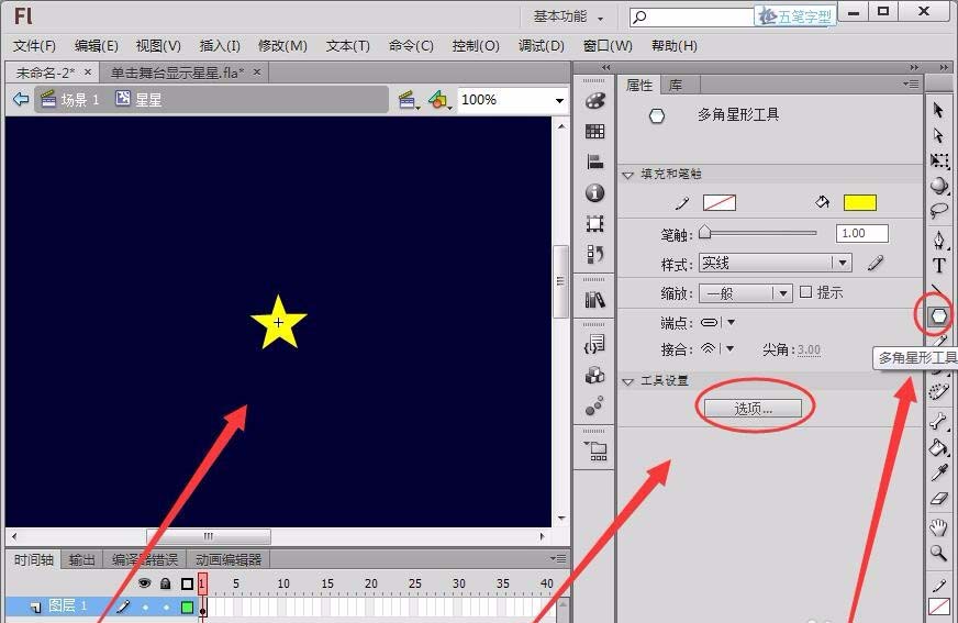3、在“編輯欄”選擇“多角星形工具”,在“屬性”面板中設置“選項”中的參數為星形,在元件編輯窗口繪制一個五角星。