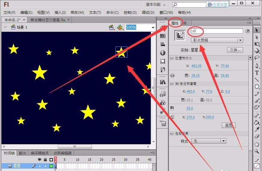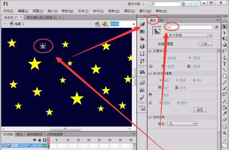 5、選中一顆星星,在“屬性”面板中將“實例名稱”取名為“s1“。