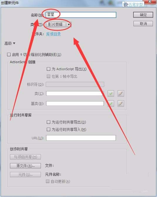 2、單擊“插入”---->“新建元件”,名稱為“星星”,類型為“影片剪輯”,插入一個影片剪輯元件。